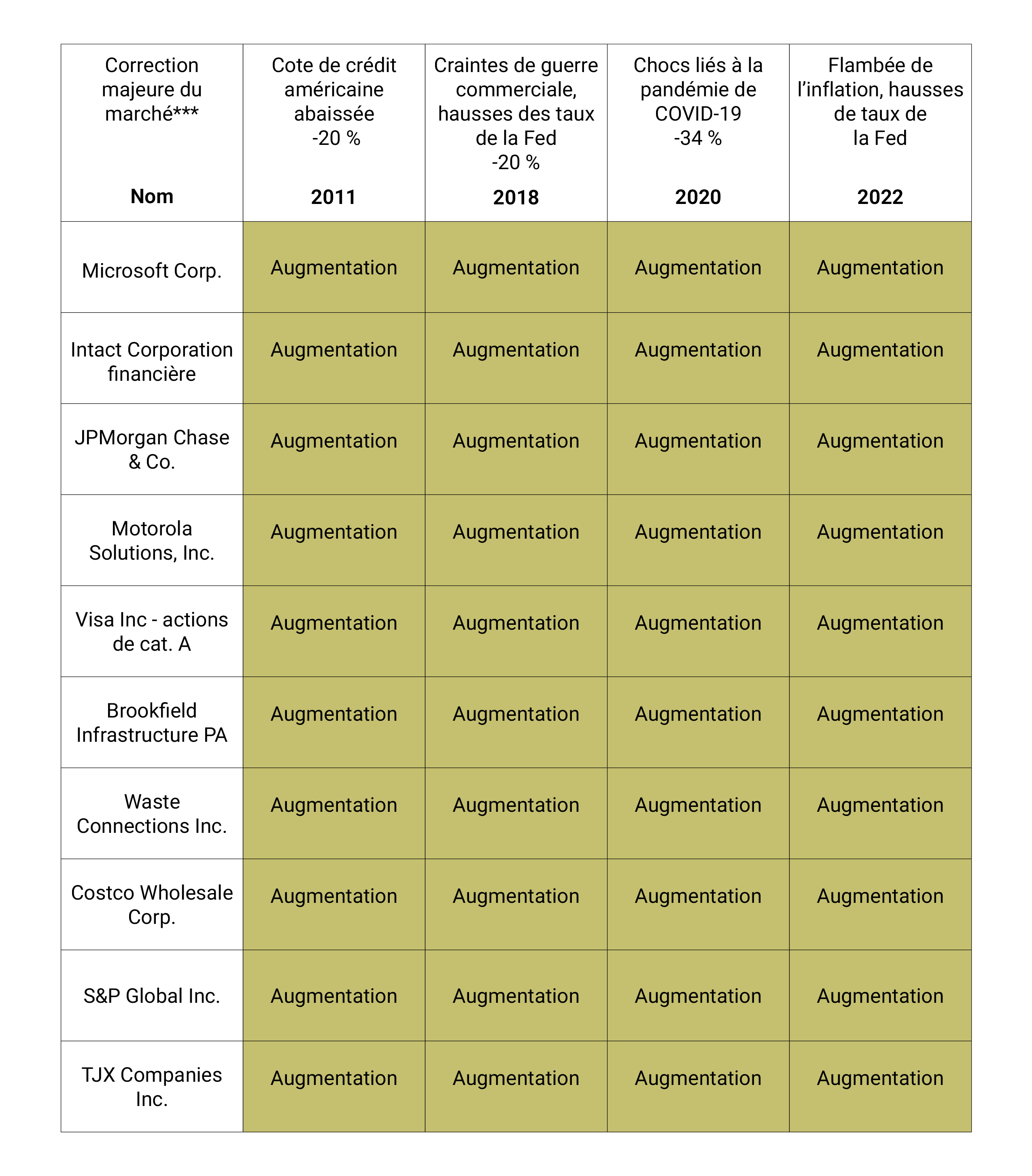Dans un contexte où de nombreux revirements politiques engendrent une grande incertitude, il est important d’investir dans des sociétés de grande qualité qui peuvent résister aux pressions. Le Fonds de dividendes BMO s’intéresse non seulement aux sociétés qui versent des dividendes, mais aussi aux sociétés qui ont des flux de dividendes croissants et qui sont des moteurs de création de valeur à long terme, ce qui s’est avéré une stratégie solide lors de crises passées. Voici comment les placements du Fonds ont résisté à divers événements difficiles du marché, y compris la pandémie de COVID-19.
